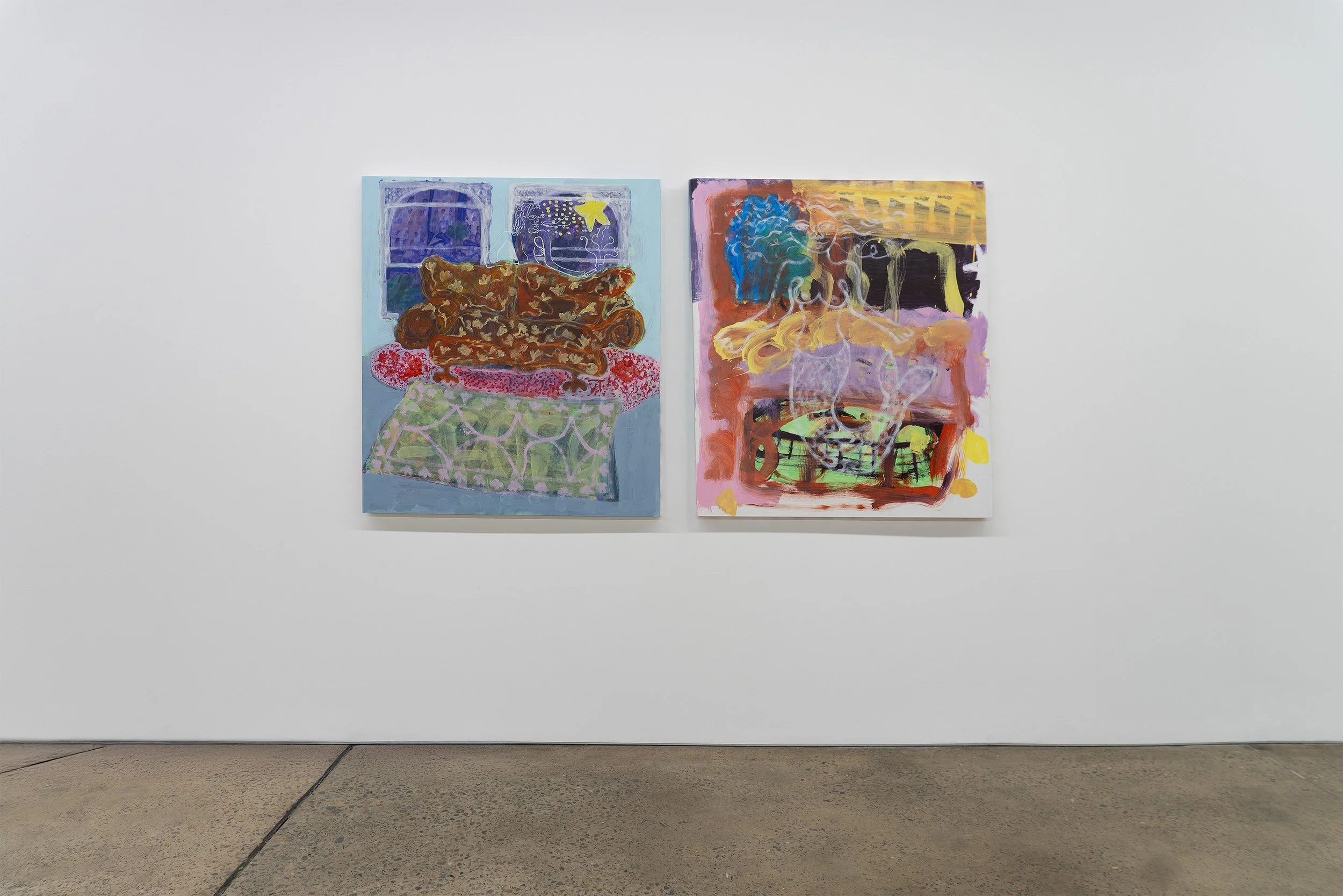 Through the window across from Atherton Gardens social housing, Fitzroy acrylic on board 104.5 x 120 cm 2025 & ‘Leah’ by Roy Orbison acrylic on board 104.5 x 120 cm 2025