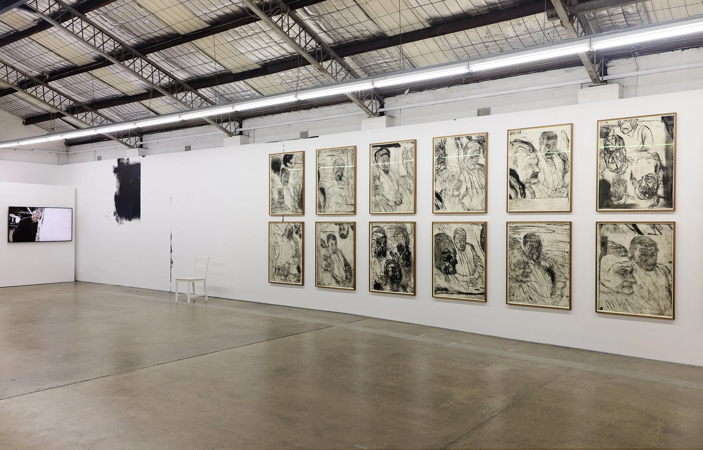Mike Parr Human Animals installation image featuring 12 drypoint etchings, wall residue from performance , performance chair and photographic documentation on loop